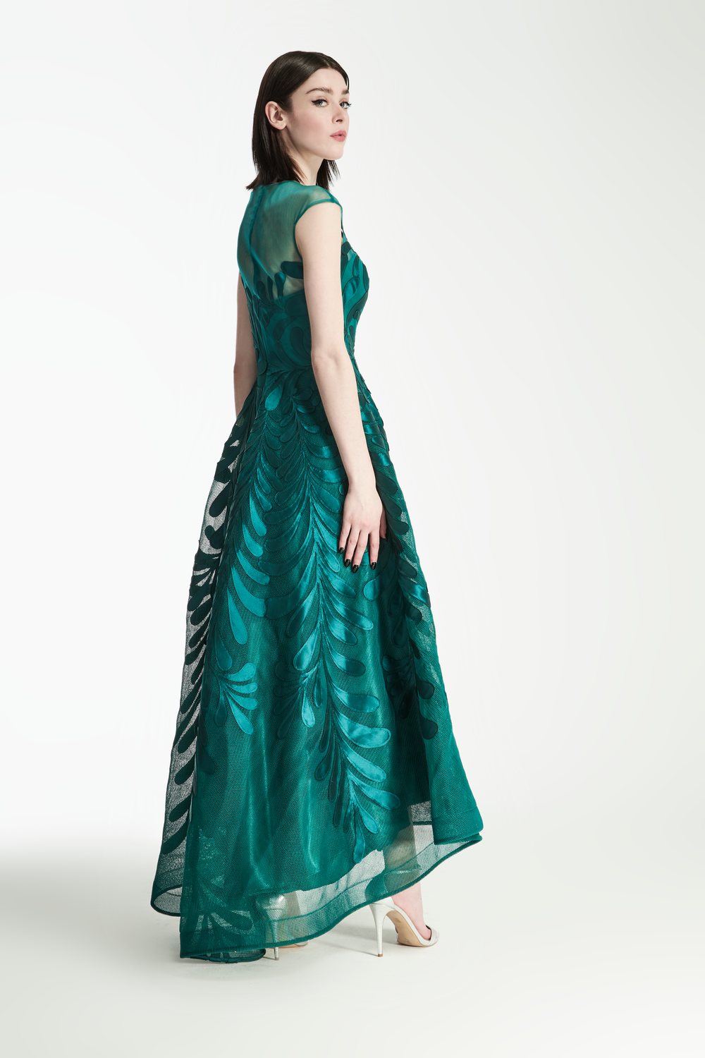 Scuba Mesh High Low Hem Dress with Mikado Floral Embroidery - Juniper