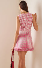 • Tailored fit, sleeveless, fringe hem, mini hem, lined