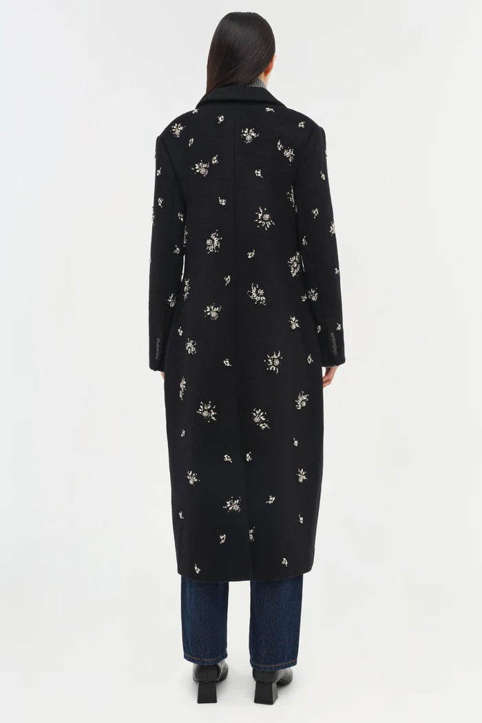 The Gianni Coat in black ia a sleek and tailored design, adorned with crystal embellishments that add a refined touch to a classic silhouette.