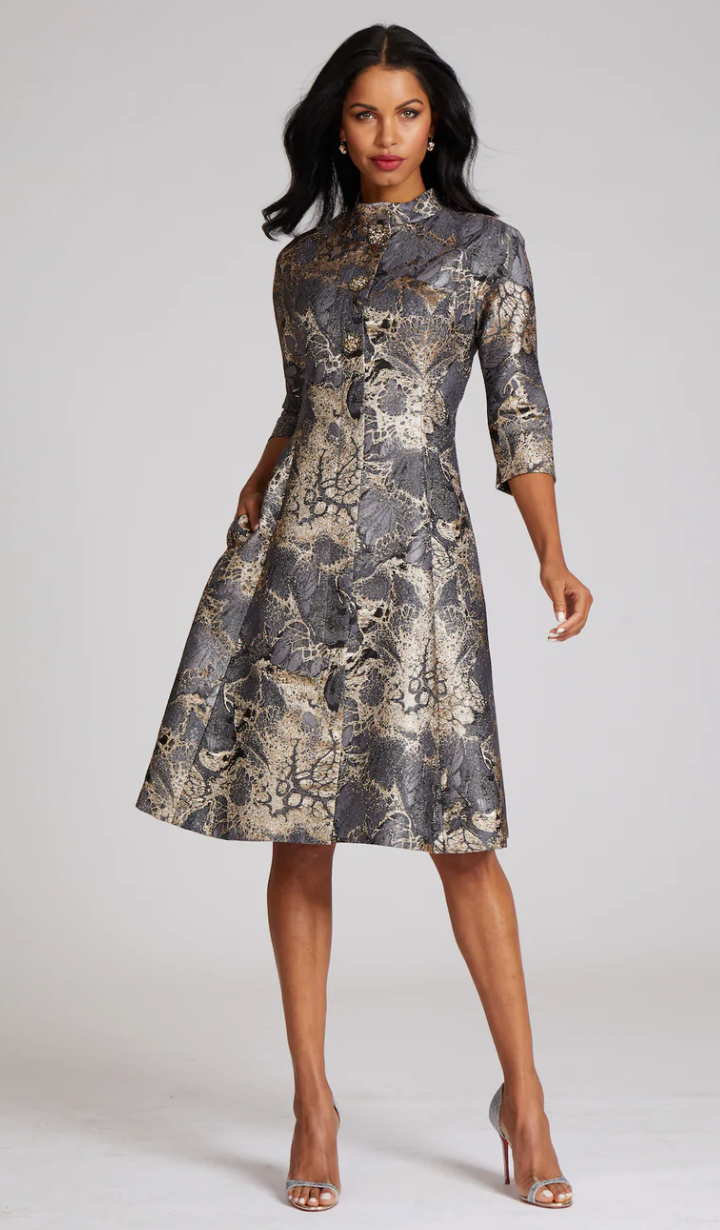 Available in a stunning pewter and gold color our metallic jacquard cocktail dress is ready for your next formal occasion! The ¾ sleeves knee length cut and mandarin neckline gives this dress the perfect amount of  coverage. The jewel buttons below the neckline gives this dress a unique touch. Pair this dress with gold heels and you’re good to go!
