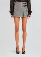 Farrimma skirt blends classic houndstooth plaid with contemporary design. This mini features elegant pleats with a double belt detail, easy transition from day to night. Pair with a crisp blouse for day and silky cami for evening events.