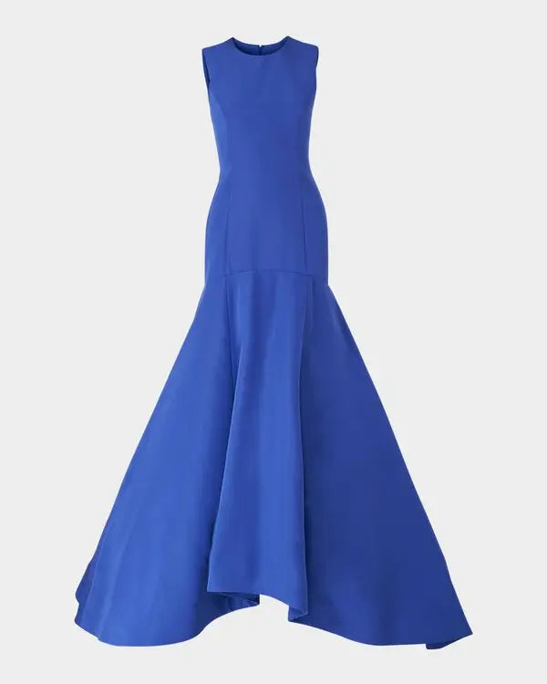 Classic gown in 100% silk with a round neckline, fitted bodice and high-low trumpet flared skirt together make a beautiful, flattering silhouette for weddings and other formal occasions.