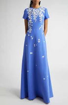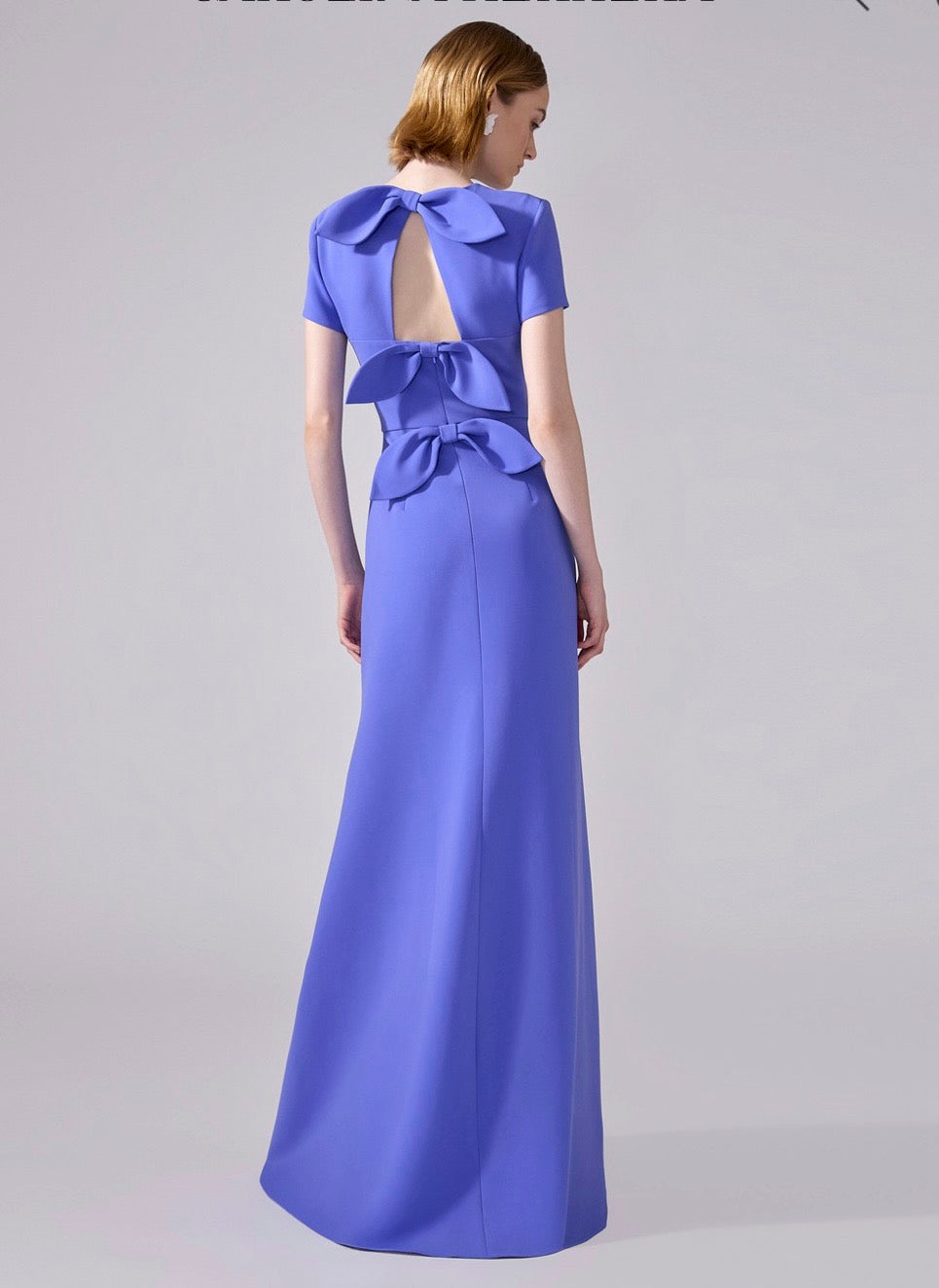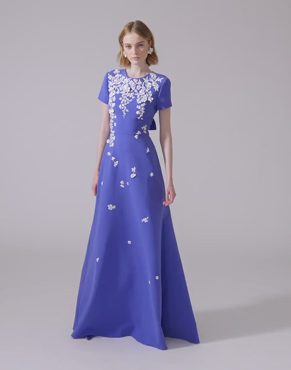 Decorative Bows embellish the back of this elegant evening gown, whose bodice blooms with embroidered wisteria in thread, crystal and beads. Cut-out back is adorned with decorative bows, concealed snap fastenings, fully lined.