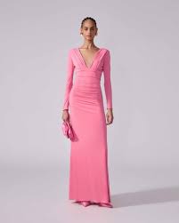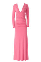 Flattering jersey gown with gathered v-neckline in front and back with ruched bodice.
