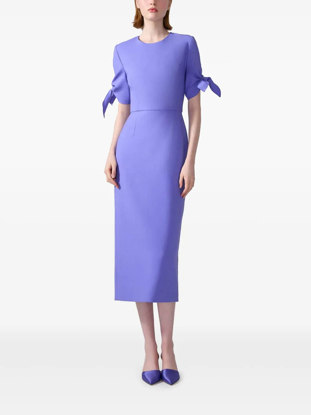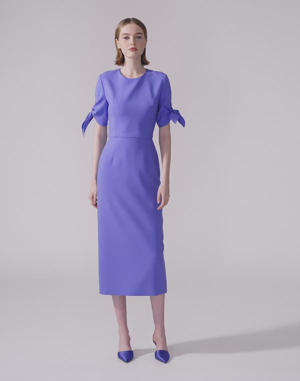 Classic midi sheath dress with tie sleeve detail, round neck and back center slit in skirt, fully lined, in a ultra-light weight wool fabrication.