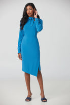 This matte jersey high neck dress is the definition of comfort and elegance. The asymmetrical finish of the dress and the slit will add originality and character to your look.
