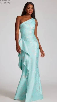 Teri Jon Jacquard One Shoulder Side Ruffle Gown