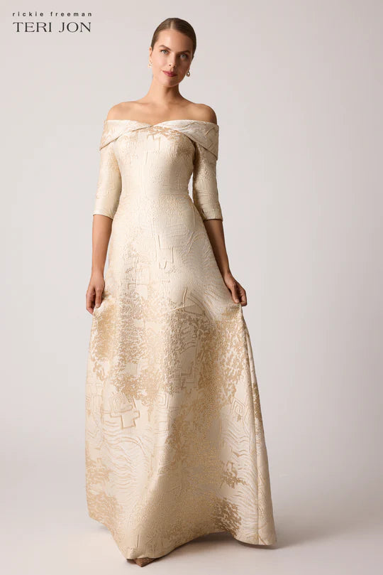 Teri Jon Metallic Jacquard Off The Shoulder Evening Gown With Sleeves
