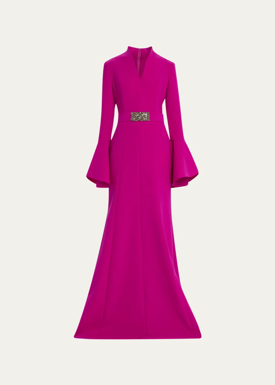 Teri Jon V Neck Crepe Flounce Cuff Jewel Buckle Gown