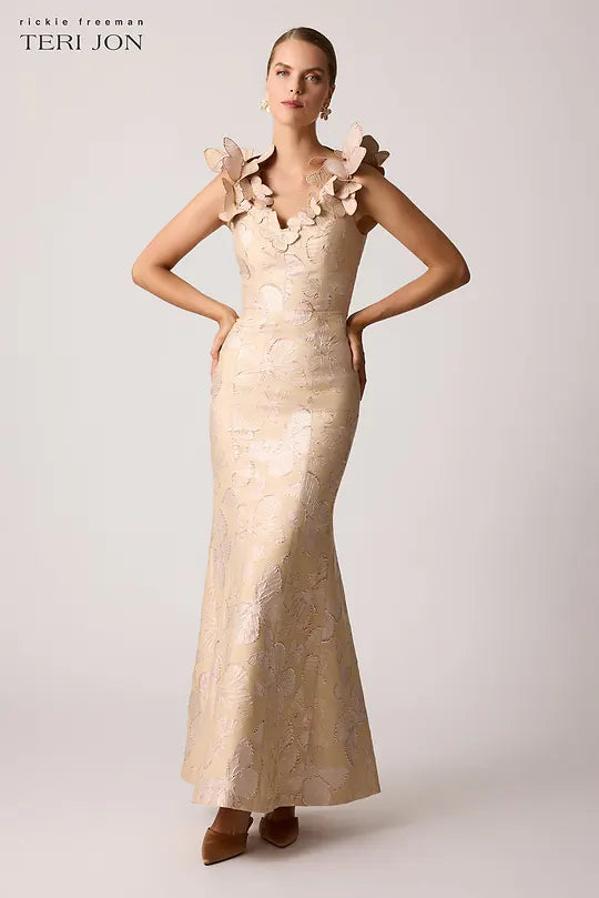 Teri Jon Metallic Jacquard Butterfly Pattern Trim Gown