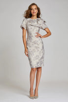 This platinum jacquard cocktail cocktail dress is a sight for sore eyes! Featuring a knee length cut, short sleeves, and a jewel neckline. The sheath silhouette creates a sculpted figure while the neck bow adds a unique touch.