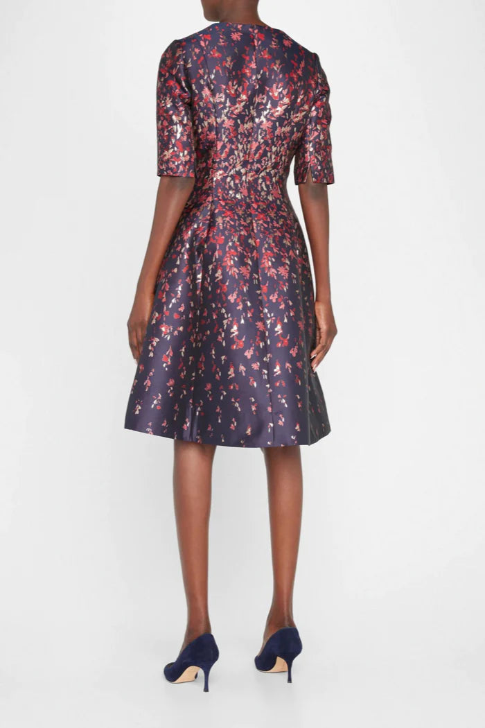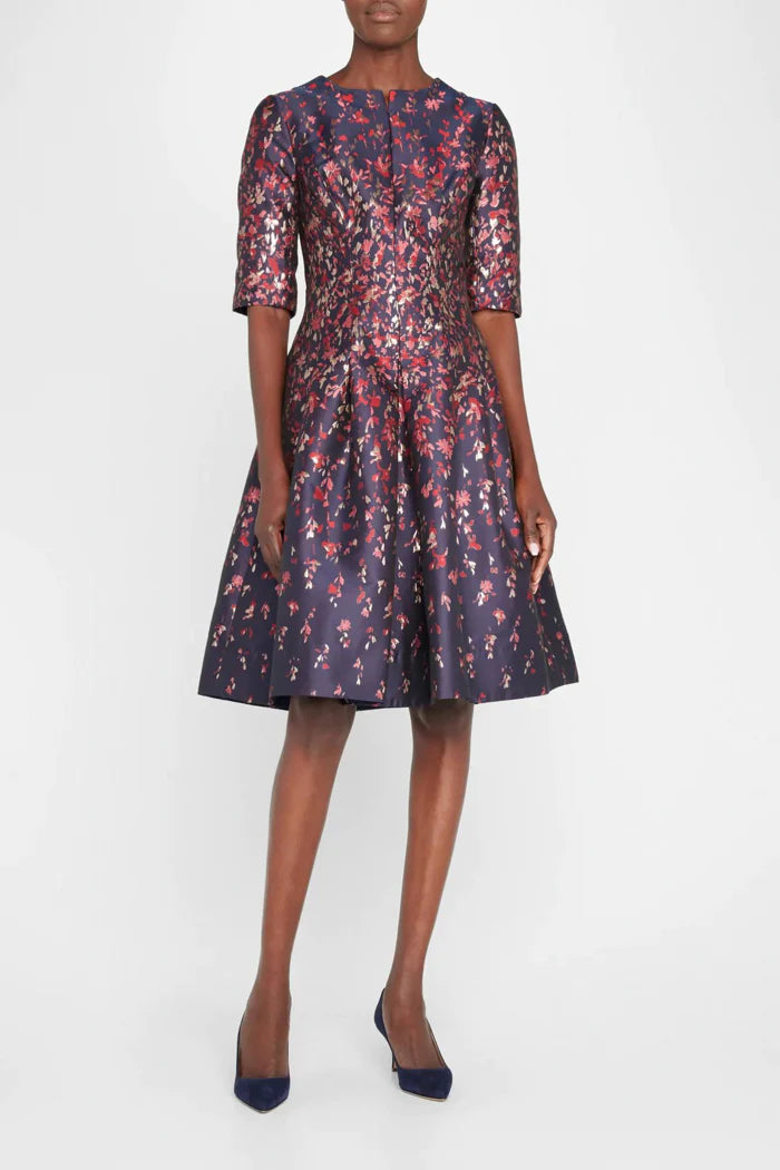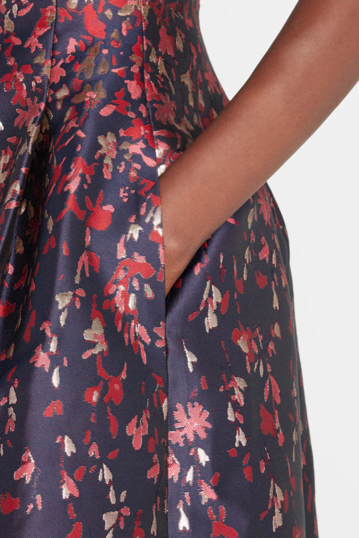 Made by Teri Jon. This is a pleated floral jacquard dress.