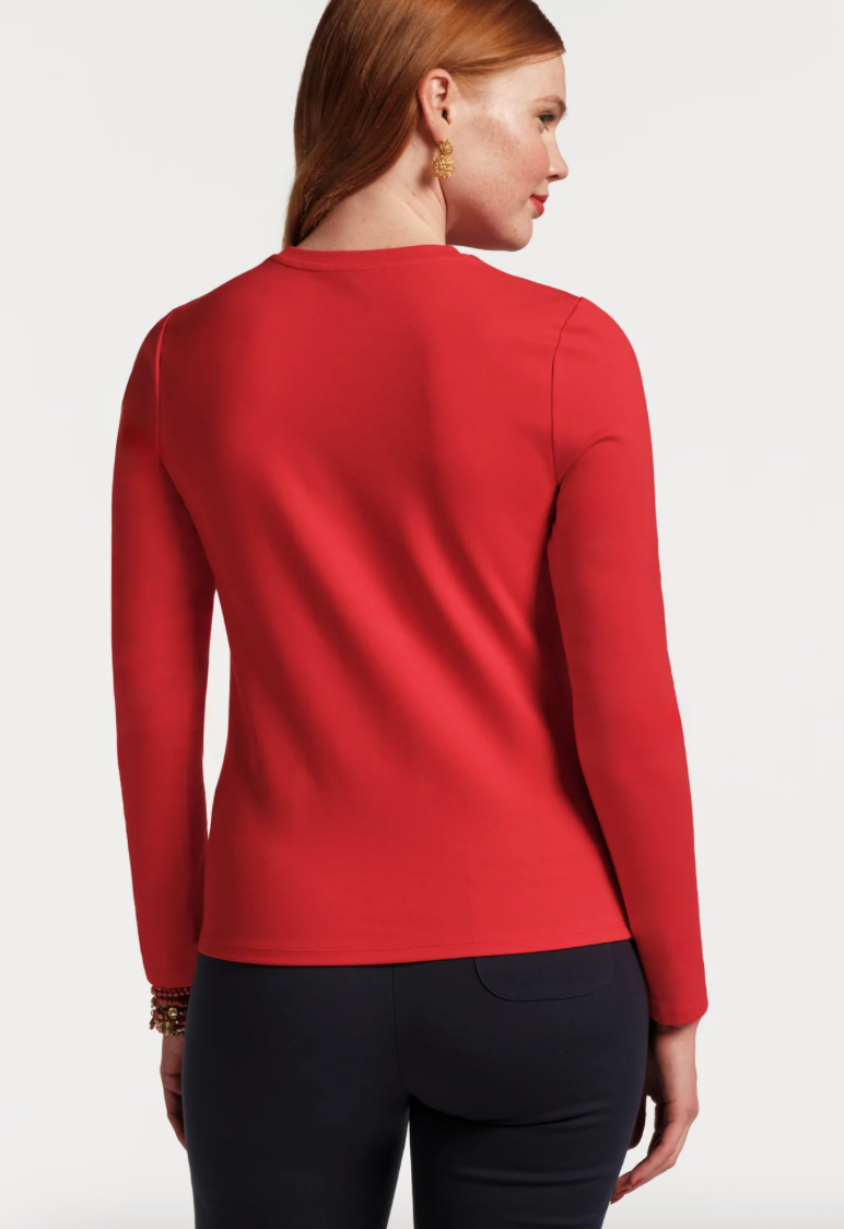 A not-so-basic basic. This fitted red long sleeve tee is made from the same softly structured, stretchy rayon blend as our best-selling Whitney Wrap. Lightweight yet substantial, it hugs just right and layers like a dream. A true year-round staple you'll keep in constant rotation.