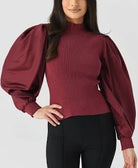A mixed-media top with a mock neckline knit shell and voluminous taffeta sleeves.